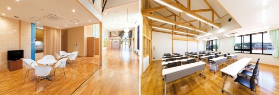 共育の拠点となるこの施設は、作手の新しいシンボルにもなります。誰もが気軽に立ち寄れて、居心地の良い、みんなの「家」となるような施設を心掛けました。外観デザインは、地元産スギ材で設えた壁や同じ勾配で統一した切妻屋根とすることで、作手の豊かな山並みになじむようにしました。また、軒の高さを揃えることで、複数棟に分かれている建物を一体感のあるものにしています。さらに、各教室には、家に入ってきてもらうような感覚で玄関を兼ねた「土間」を設けました。この土間は、日射熱を蓄積して放射し、外気から教室を守る役割もあり、夏は冷涼で昼夜の寒暖差が大きく、冬は寒さが厳しい作手の気候に対応するメリットがあります。その他、教室や廊下に設けた高窓による採光の確保とドラフト効果を利用した自然換気や、深い軒による日射のコントロールなど、環境に配慮したデザインを取り入れながら、室内環境の居心地の良さも追及しています。