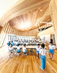 小学校、交流館内にはそれぞれに共育を意識した空間が設けられています。その一つが「ランチルーム」です。旧作手村の時代から各学校にあったランチルームは、親子給食会や地域の方との交流給食会などが行われており、作手で育った卒業生なら誰でも楽しい思い出がある場所です。新校舎のランチルームもそんな交流空間になることを意識し、親しみが感じられる特徴的な構造の外観にしました。その形状から子どもたちに親しみを込め、“プリン”と呼ばれています。