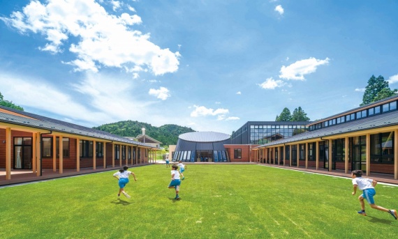 愛知県新城市では、学校・家庭・地域のあらゆる人が、ふるさと新城の「三宝(自然・人・歴史文化)」を活かし、共に過ごし、共に学び、共に育つ、「共育(ともいく)」という教育理念を掲げています。子どもだけでなく大人も実践する共育は、地域のネットワークづくりや交流に貢献し、やりがい、生きがいのあるまちづくりにつながるものです。そんな共育の場として新城市作手地区に誕生したのが、「新城市立作手小学校」の新校舎と地域の活動拠点となる「つくで交流館」です。