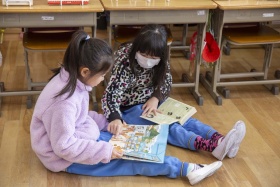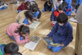 一人でじっくりと読んだり友達と一緒に絵本をのぞき込んだり、子どもたちはそれぞれ楽しそうに本を読んでいます。先生方も子どもの様子を見ながら、本への興味を促すように声をかけたり一緒に読んだりしています。