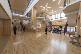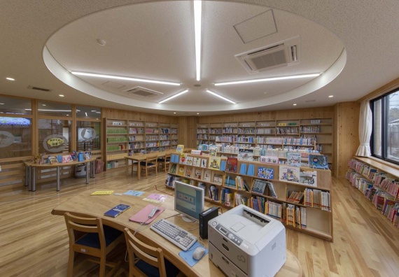 笠間小学校は旧校舎が老朽化したため改築され、2018年春から新しい校舎での学校生活が始まっています。新しい図書館は、校舎の中心となる2層吹き抜けの「だんだんホール」と連動して使うようにも考えられており、子どもたちの交流の場にもなっています。