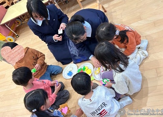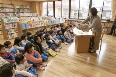「読み聞かせ」は「だんだんホール」の階段に子どもたちが座って行なうこともあるそうですが、この日は暖かい図書館の中で始まりました。先生が絵本のページを見せながら、内容に合わせて抑揚をつけながらゆっくりと読んで聞かせると、子どもたちは時に笑ったり驚いたりしながら食い入るように見ています。
