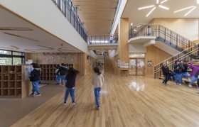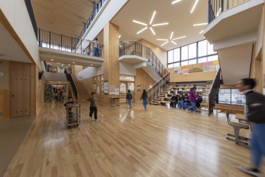 エントランスを入ると広くて明るい大空間「だんだんホール」があり、そこから左右に伸びる吹抜け空間の周囲を普通教室や特別教室が囲んでいます。図書館は「だんだんホール」に面した一角にあり、広いガラス窓を通して中がよく見えるようになっています。(写真の右寄り奥が図書館)