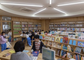 読み聞かせの授業が終わって、お昼休みの時間には多くの子どもたちが「だんだんホール」に集まってきます。授業のときとは逆に、ここから自然に図書館の中に引き込まれていき、普段から本と触れ合うようになることも増えていきそうです。
