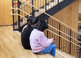 図書館から出て「だんだんホール」の階段の上や、階段下の閲覧コーナーで読んでいる子どももいます。図書館で「調べ学習」や「読み聞かせ」といった授業を行なうためには、できるだけ広さがあるのが理想ですが、その分をオープンな空間で補っています。