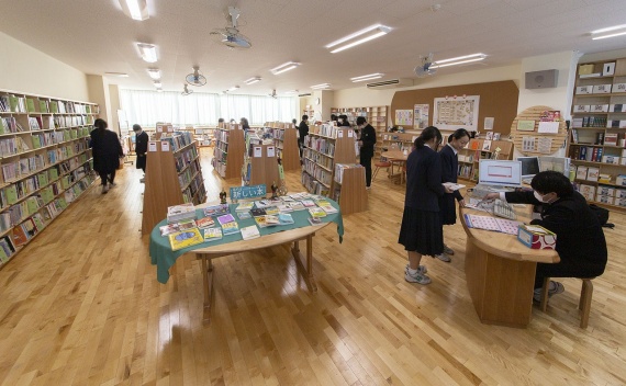 新しくなった図書館には、市内の他の小学校で採用実績があった平湯モデルが採用され、明るく居心地がいい空間へと生まれ変わりました。生徒たちは、ビブリオバトル(知的書評合戦)や貸し出し・来館ポイントを集めるイベント等、積極的に図書館の利用と読書活動を推進しています。
