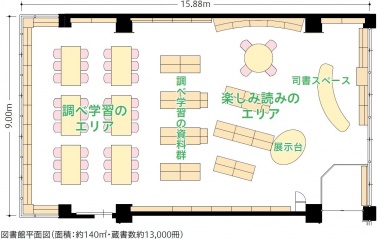 湾曲大型本架の前には画集や絵本などの大型本を閲覧できるようにイスとテーブルが設置されている。