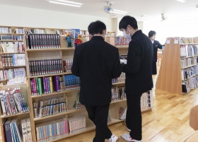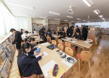 授業でも図書館は活用されており、写真は絵皿の下絵を制作するために図書を参考にしている美術の授業風景。