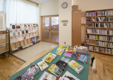 入った正面の大きな展示台には新着本が並べられ、また入口の脇には先生のおすすめする本が展示されている。