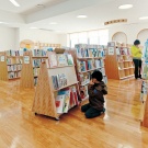 「暮らしのコーナー」や「ティーンズルーム」など、多世代が楽しめる2階。特に、全体の4割を占める児童書が配架された「こどものエリア」は広く、子どもを第一に考えた町の思いが現れている。湾曲した絵本架が長く続き、たくさんの表紙が並ぶ「絵本のコーナー」は、本に触れる格好の場となっている。