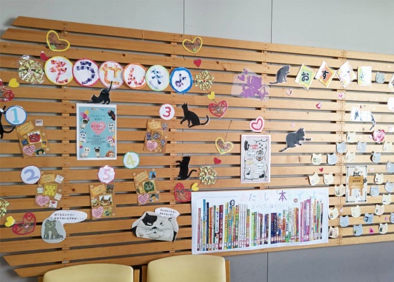人気投票ではどのネコが1位になるでしょう。仲良しタイムには図書委員がネコの絵本を読み聞かせしています。ネコ好きにはたまらないネコだらけの図書館です。「次は犬の本、特集してくれるよね~」と犬好きから要望が・・・。