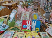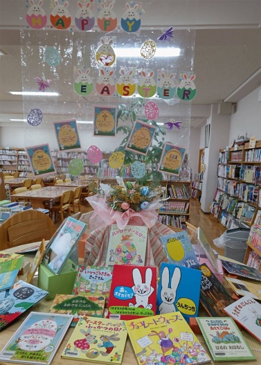 展示台にはイースターにちなみ、たまごやウサギ、にわとりがでてくるお話を集めまし