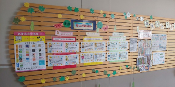 掲示板:夏休みの課題図書の紹介です。聖母では全国読書感想文の課題図書以外に、図書館おすすめの本を高学年、中学年、低学年に各4冊紹介しています。