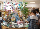 展示台:天井からつるしているビニールのクロスには金魚を、展示台には朝顔を飾りました。紹介している本は夏休みの読書におすすめの本のほかに、読むとさむ~くなる怖い本も紹介しています。