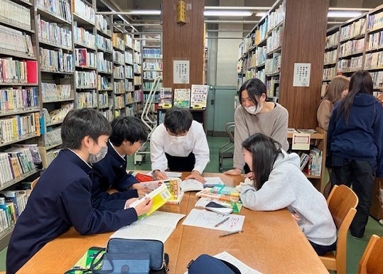 この図書館には「ポプラディア」という子ども向けの総合百科事典が2セットあるのですが、その内の1セット1巻~12巻を机の上に並べて『12巻、全部揃って1冊の百科事典ですよ!』という先生の説明に子どもたちはちょっと驚いた感じ。
