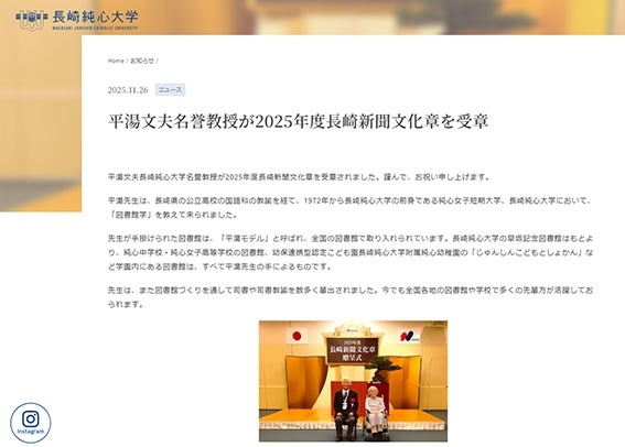 平湯文夫先生(91)(図書館づくりと子どもの本の研究所 主宰、長崎純心大学 名誉教授)が「長崎新聞文化章」を受章し、11月25日に長崎新聞文化ホール・アストピアで贈呈式が開催されました。