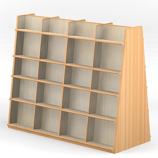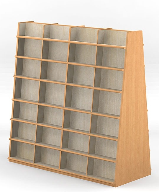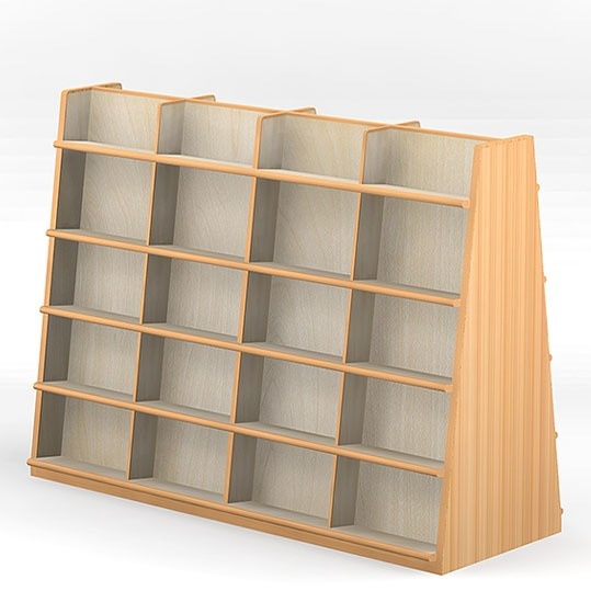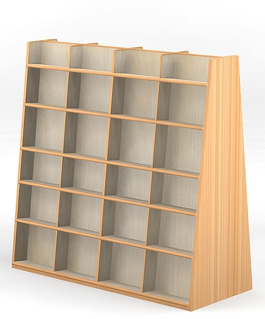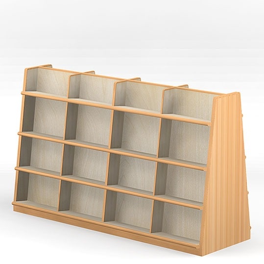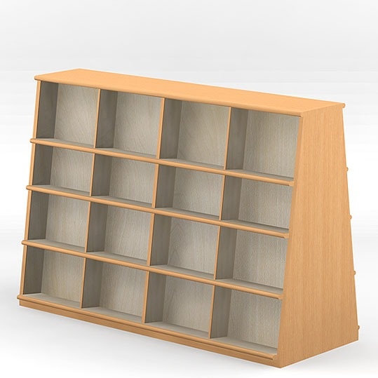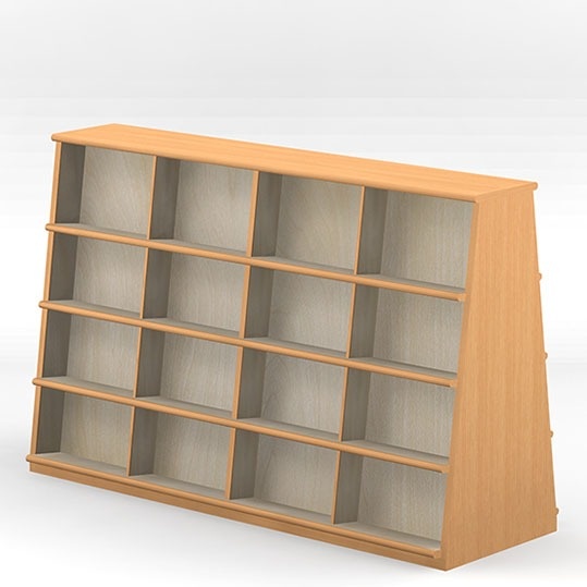 ■ 低くて傾斜していて、天板がないので、上からの照明に関係なく書架が置けますし、模様替えもできます。