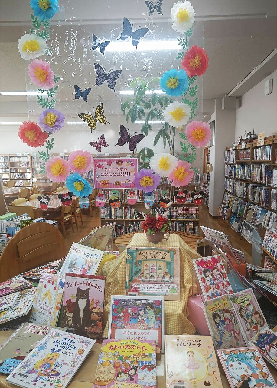 2月はバレンタインデーのある月なので展示台にはスイーツの本を集めました。お菓子がでてくるお話、スイーツの作り方など華やかな本が集まりました。