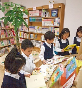 図書館は子どもたちに人気です。読書の時間はもちろん、なかよしタイム( 長い休み時間)や、昼休みにも静かに読書する子どもたちの姿が見られます。2013年度からは京都聖母学院幼稚園の年長さんも招待して図書館の本を借りたり、紙芝居を見たりしてもらおうと計画しています。また、本校は国際コースと総合コースがありどちらも英語に力を入れています。授業以外の普段の生活にも英語で話す機会を作っていますが、今年度は英語で本を借りる日を設定しようと考えています。子どもたちが図書館に親しみ、ますます、本が好きになってくれることを願っています。