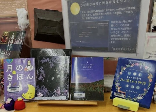 9月はお月見のテーマにしました。月の満ち欠けを黒の布を天井からつるし、月の満ち欠けの写真をディスプレイしました。奥に見える、天井の国旗は、運動会があるので図書委員が中心に国旗の本を見ながらつくりました。