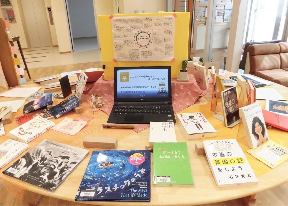 最も大きな展示台は、SDGsコーナーとなっています。関連書籍だけではなく、高校3年生が新中学1年生のために作成した「SDGs紹介動画」も視聴できるようになっているのがポイント。この動画は、コロナによる長期休校中に、高3有志がリモートで作成しました。
