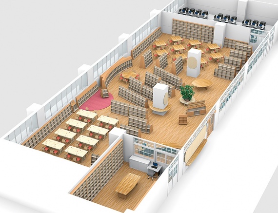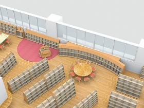 中学生の調べ学習のコーナー もう一つは、奥の静かなところに中学生用の調べ学習のコーナーを設けます。書架で囲んだ落ち着いた空間とし、調べものもスムーズにできます。
