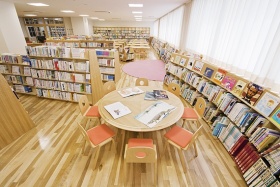 絵本・写真集・画集コーナー 湾曲した窓下書架にビジュアルな本を集めます。広げて見られるテーブルを側に置くと、美術全集なども利用されます。大型本をここに集めることで、他の書架の配架がしやすくなります。このコーナーの丸テーブルは、小学生と中学生の交流の場となることも期待しています。