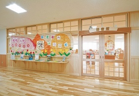 入口はシースルーにして楽しそうな館内が見えるように。左には大きな掲示板と展示台で子どもたちを呼び迎え、図書館に誘い込まれるように演出しました。