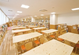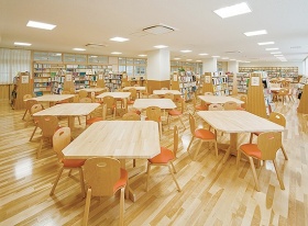 小学生の調べ学習のコーナー 資料を周りに集めた調べ学習のコーナーを設けます。4人掛けでゆとりをもたせ、ノートパソコンも使用できます。