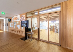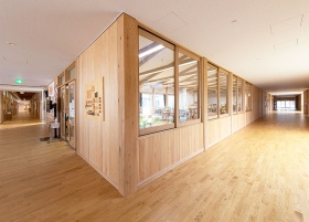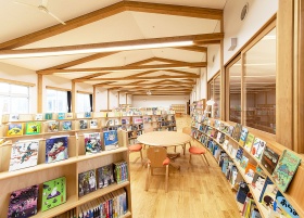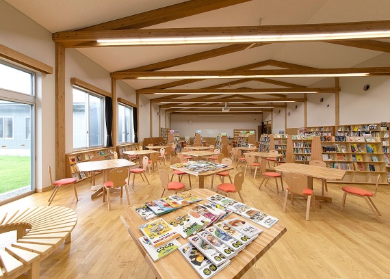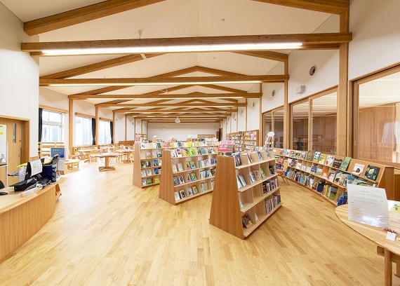 校舎中央に位置するメディア棟に配置されているメディアライブラリー(図書館)には、これまで市内の他の小中学校で実績があった平湯モデルが採用され、木造の校舎に調和した温かみのある空間となっています。