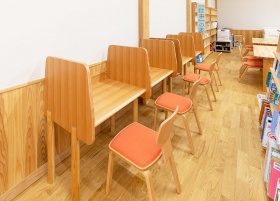入口を入ってすぐの場所には展示台が設置されている。楽しみ読みのエリアにはイスとテーブルが設置されており、大型本を閲覧することができる。