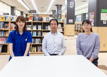 共用エリアに面した図書館の入り口はガラス張りにし、外から中の様子が見えるようにして来館者を招き入れます。カウンター前のスペースには丸い展示台を設けて興味を喚起。子育て世代が利用しやすいよう、入り口近くに絵本や児童書を配置し、読み聞かせのキッズコーナーとともに「子どもたちの図書館」をアピールしています。