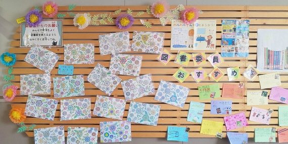 掲示板には4年生が読書の時間に少しずつ取り組んだぬりえの完成品を展示しました。